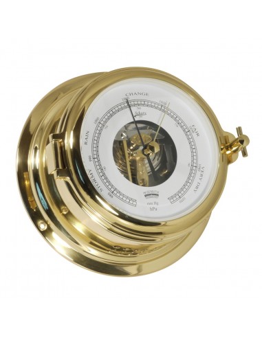 Mooie barometer met open wijzerplaat, daardoor kun je een deel van het uurwerk aan de binnenkant zien van de klok. De barometer heeft een indeling met hPa/mm met witte wijzerplaat en is gemaakt van prachtig glanzend messing. Deze barometer komt uit de Midi 155 collectie van Schatz 1881 tegenwoordig geproduceerd in Denemarken.