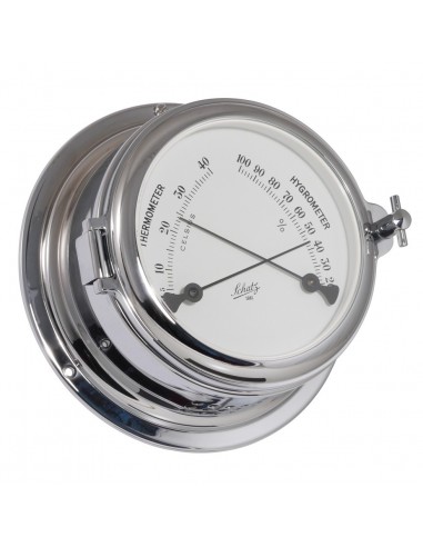 Deze thermo en hygrometer heeft een indeling in ºC en ºF op een duidelijk leesbare witte wijzerplaat. De comfortmeter is gemaakt van verchroomd messing en beschikt over een patrijspoort voor een gemakkelijke toegang naar de wijzerplaat. Deze comfortmeter komt uit de Midi 155 serie van Schatz 1881.