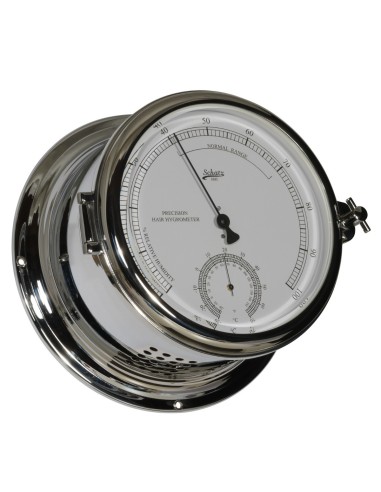 Deze mooie haarhygrometer meet zeer nauwkeurig. De haarhygrometer is gemaakt van verchroomd messing van hoge kwaliteit en de meter heeft een duidelijk leesbare witte wijzerplaat. Deze nauwkeurige haarhygrometer komt uit de uitgebreide Royal 180 collectie van Schatz 1881.
