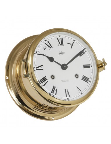 Prachtige mechanische klok met glazen slaand en patrijspoort voor een gemakkelijke toegang. De mechanische klok is gemaakt van glanzend messing met duidelijk afleesbare witte Romeinse wijzerplaat. Deze mechanische klok behoord tot de bijzondere Royal 180 collectie van Schatz 1881 tegenwoordig gemaakt in Denemarken.