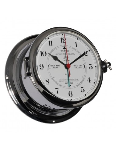 Zeer elegante quartz klok met getijden uurwerk op een Arabische witte wijzerplaat. De quartz klok is gemaakt van verchroomd messing en heeft een patrijspoort aan de zijkant voor makkelijke toegang tot de wijzerplaat. Deze quartz klok komt uit de Royal 180 serie van Schatz 1881 bekend om hun goede kwaliteit!