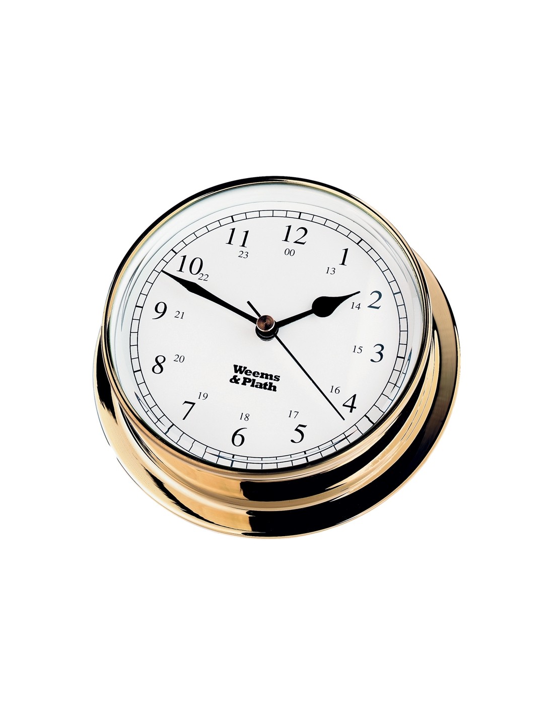 Mooie quartz klok met witte Arabische wijzerplaat gemaakt van messing. Deze Endurance I 125 quartz klok beschikt over een Slide-n-Lock montagesysteem voor een makkelijke bevestiging aan de muur en daarbij zijn de montage schroeven niet zichtbaar. Deze quartz klok behoord tot de Endurance I 125 serie van het merk Weems & Plath.