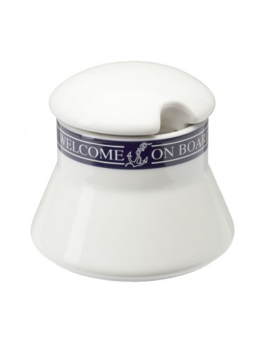 Deze suikerpot met deksel zal prachtig staan bij jou aan tafel of in jouw keuken. Deze suikerpot met 'Welcome On Board' tekst komt uit de serie van Welcome On Board en is gemaakt porselein. Tevens is hiervan ook een mooie Melkkan te bestellen.